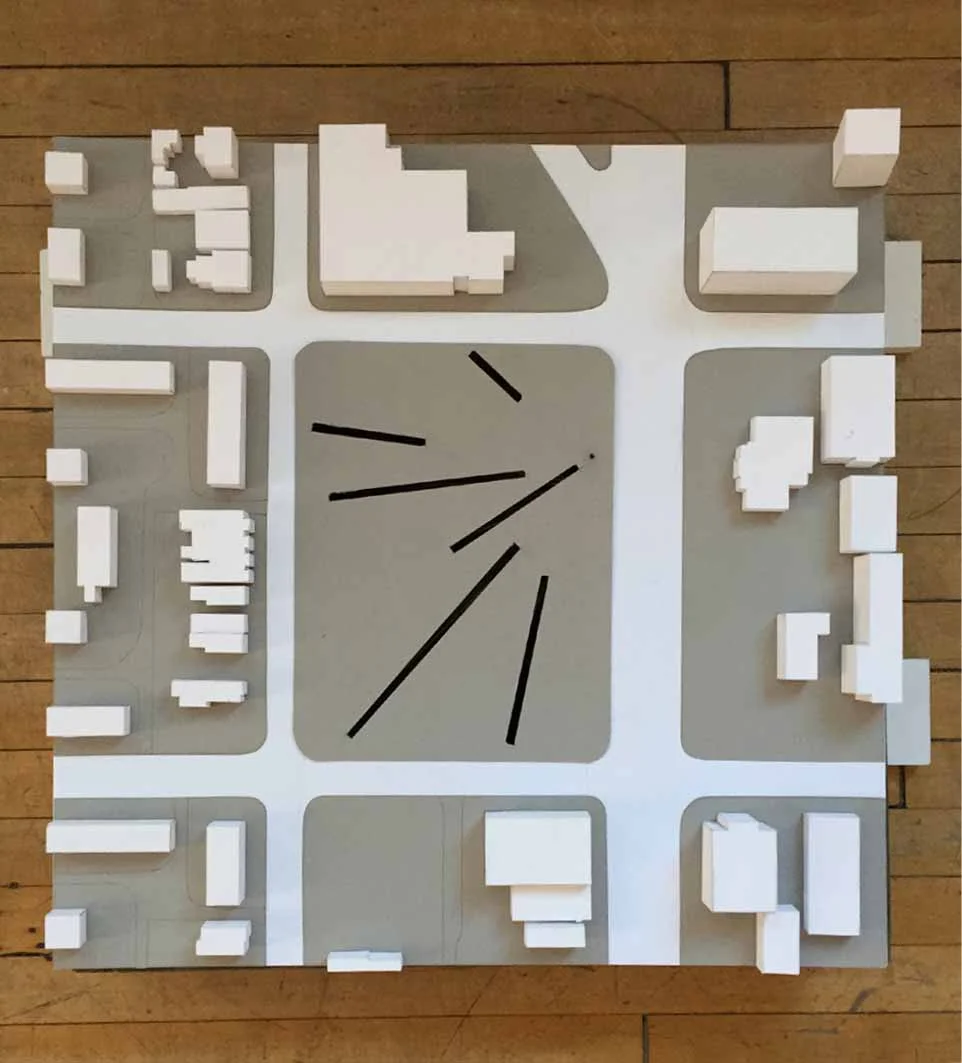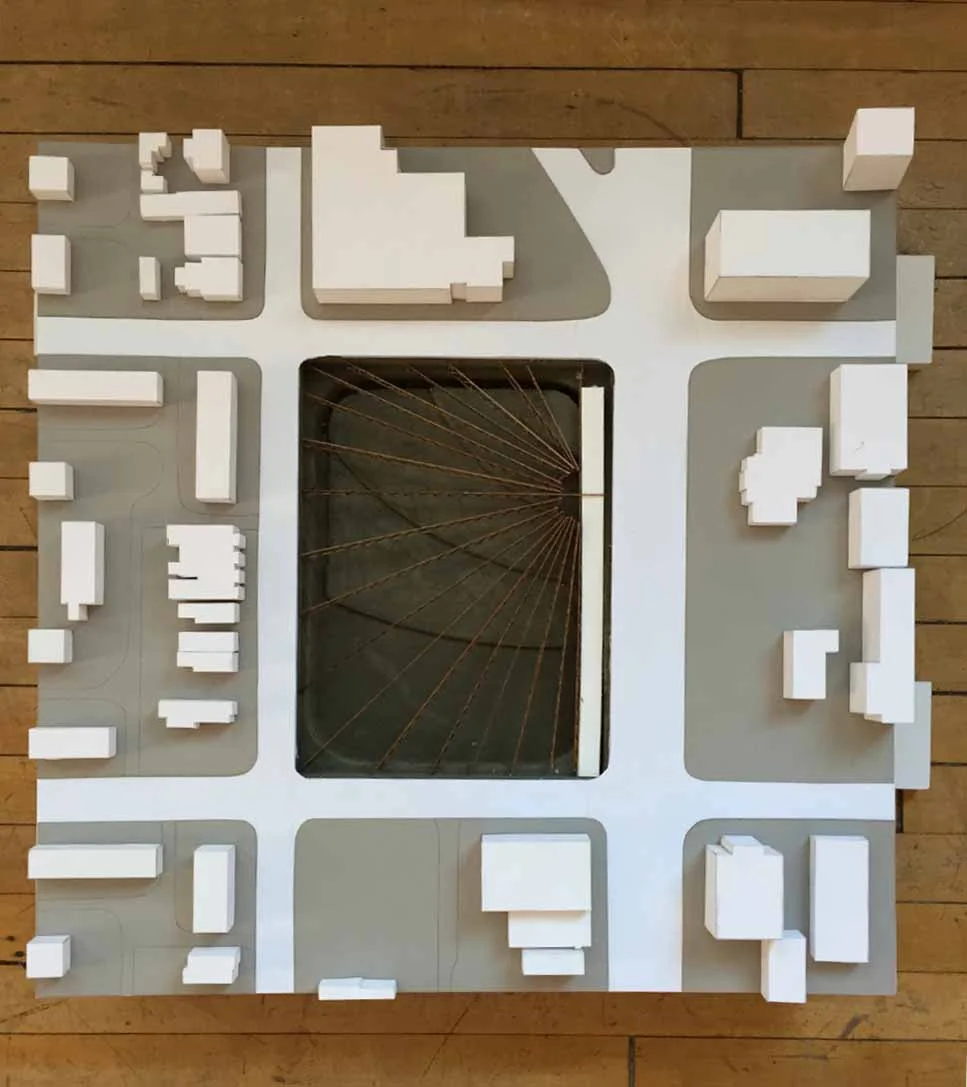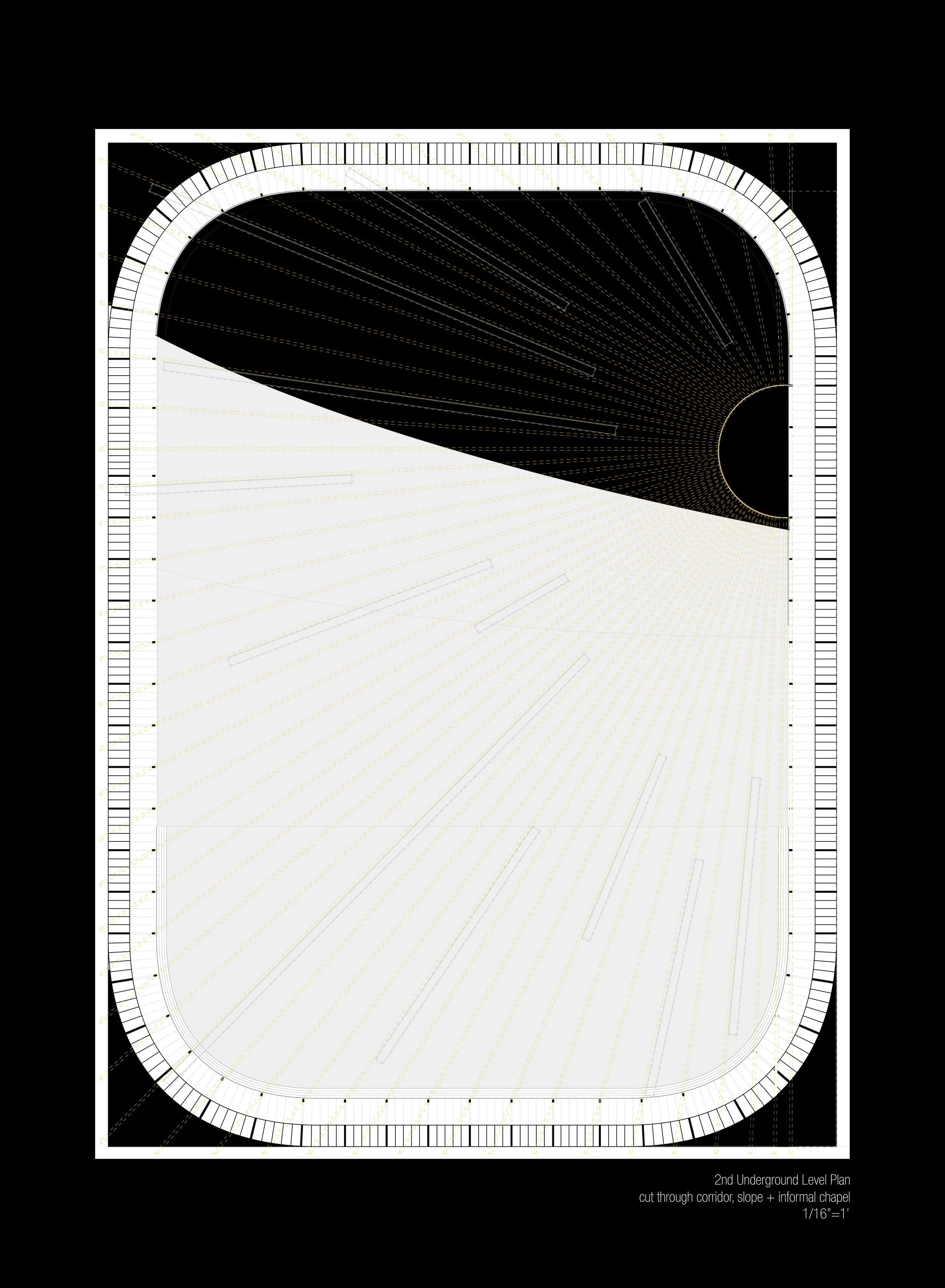 This urban cemetery is in Alexandria, Virginia, a predominately Catholic city just outside of Washington, D.C. When faced with the urban scale problem of providing thousands of burial spaces within a city block, the design proposal is an underground mausoleum with a open lawn area above ground.