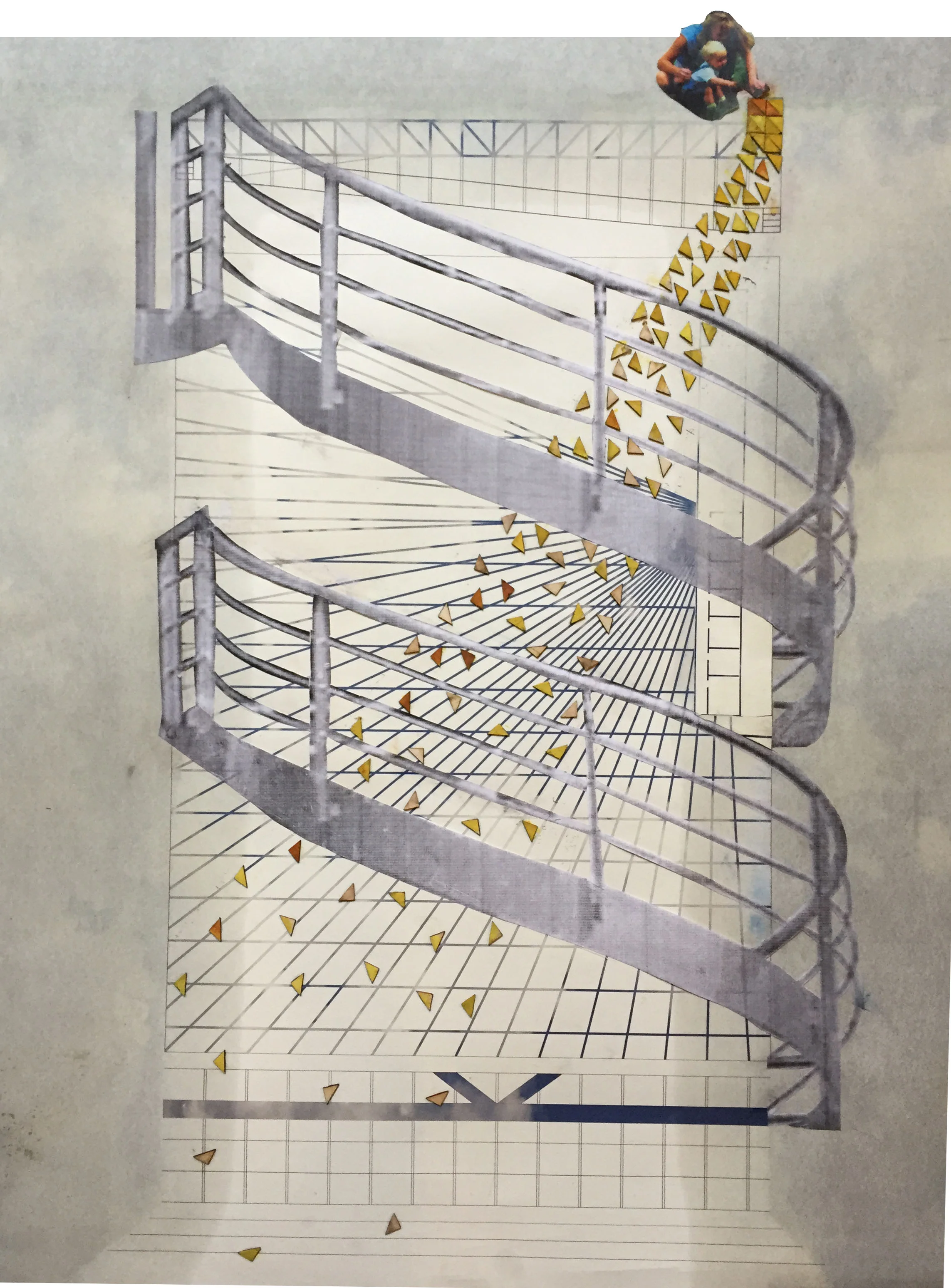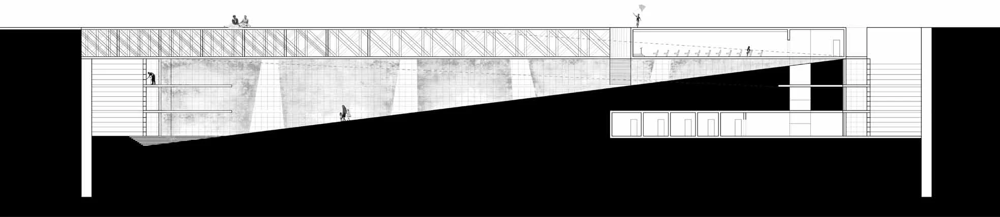 Concept collage of continuous ramp and light well concepts over orthographic drawings