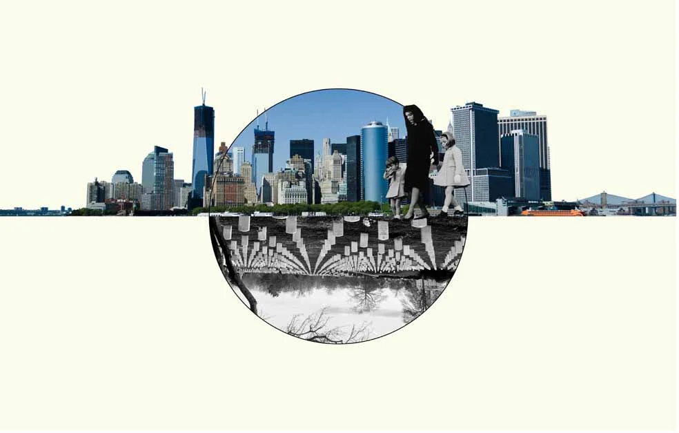 Concept collage of decent from city into sacred space