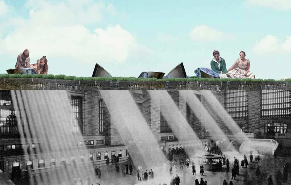 With the separation of parkland above and sacred space below, the cemetery is contrasted with [and validated by] the lively city life transpiring above. The two levels are reconciled by light wells that define the public space above and stream light into the space below ground.