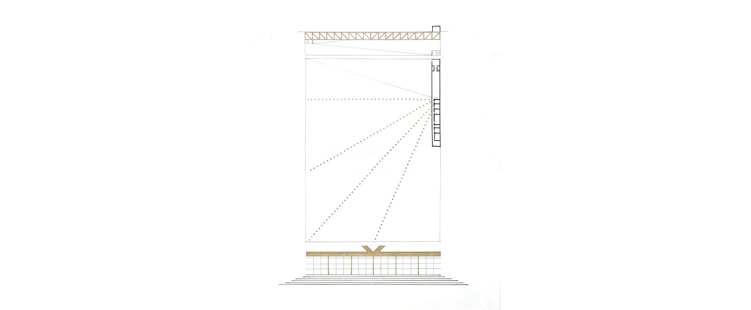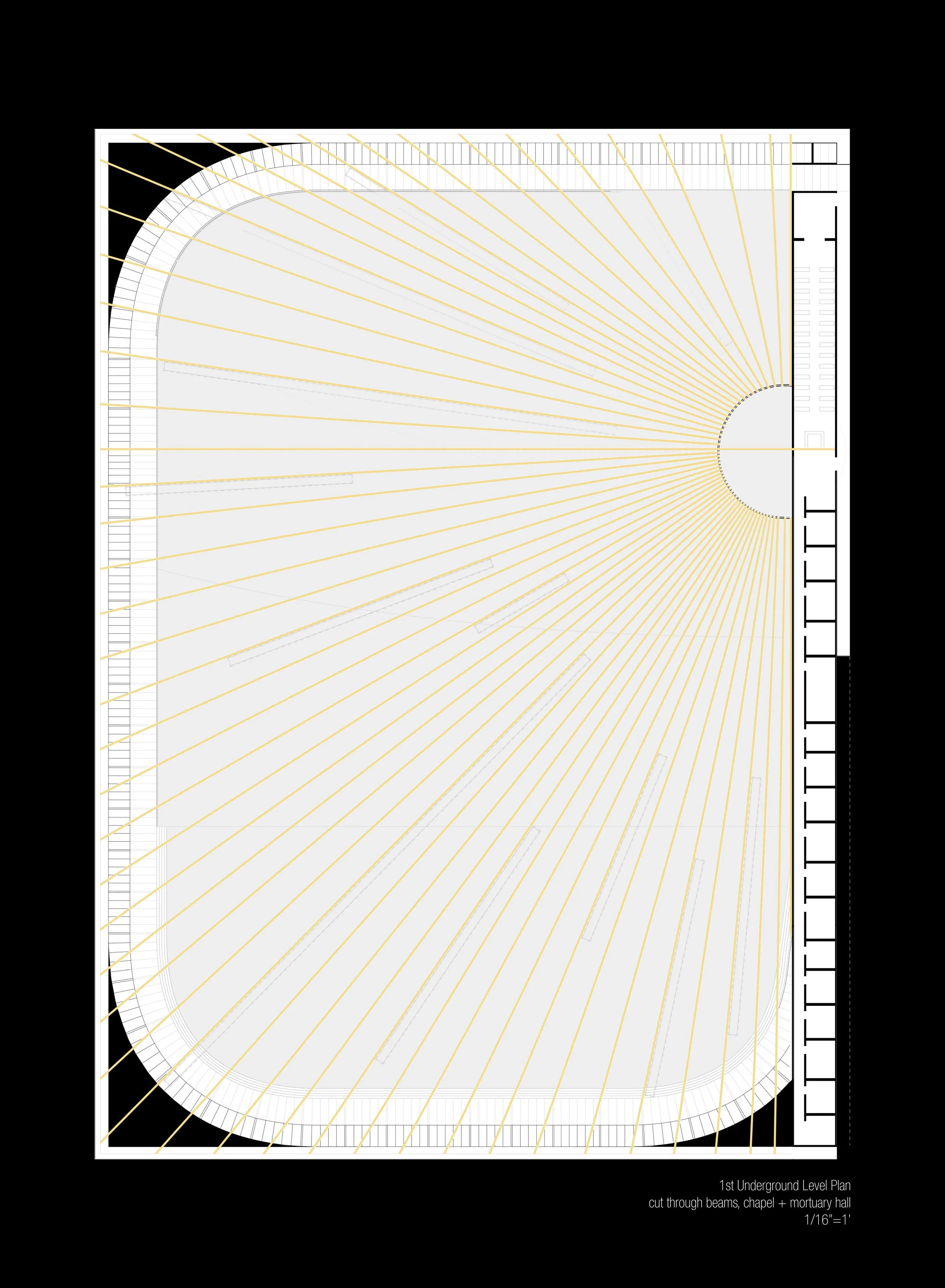 Because the building spans an entire city block and exists mostly underground, 15 foot-tall trusses are used to hold up the ground above and create a completely open space below. The trusses are arrayed in a way that, if to continue, they would intersect at the crucifix on the back wall of the chapel in the eastern side of the site. The structure is designed to seem vast and endless at the entrance and become tangible in the halls of the mausoleums, representing the simultaneous vastness and tangibility of God.