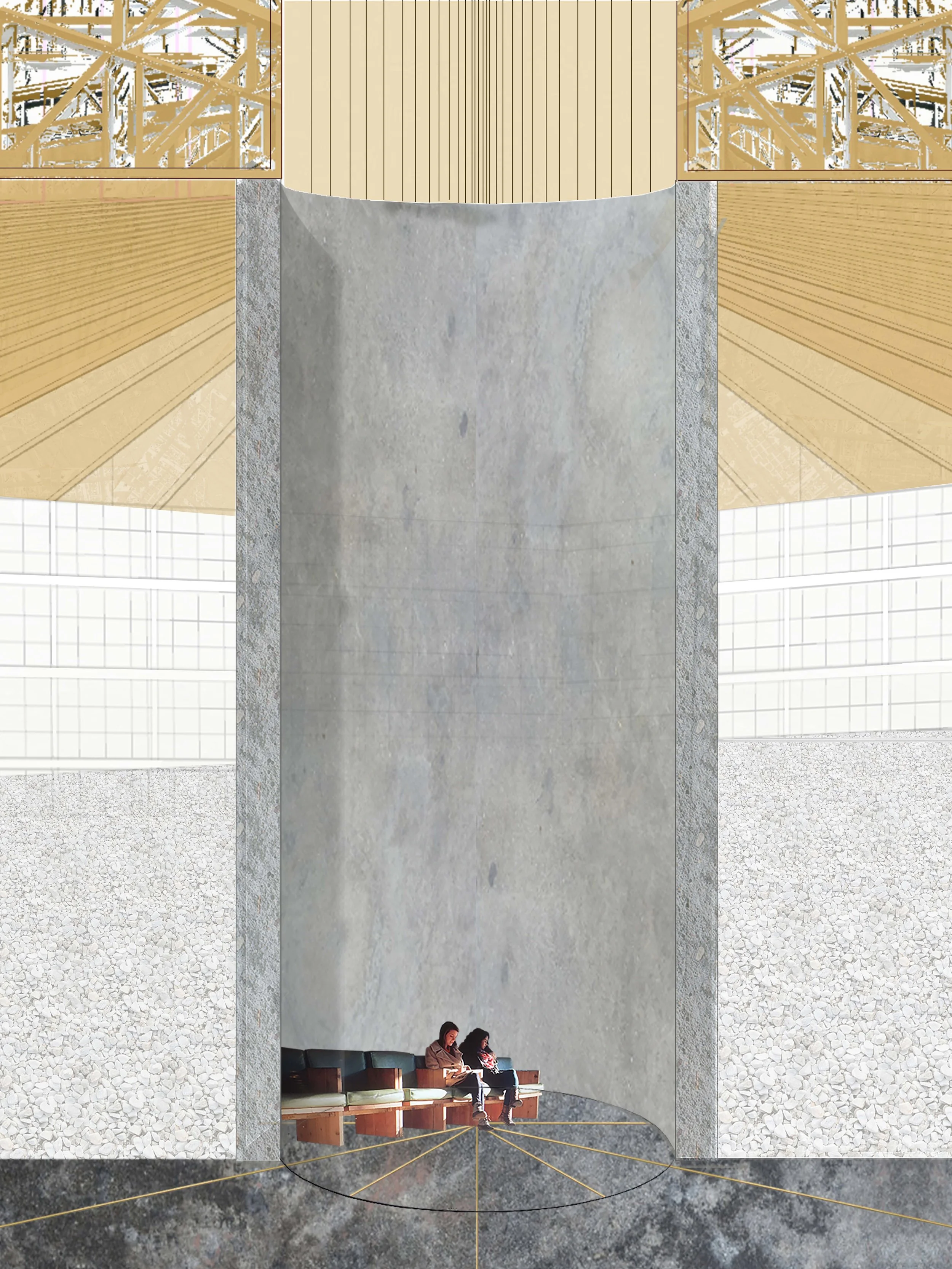 Niche space for reflecting made from the concrete cylinder upholding the trusses